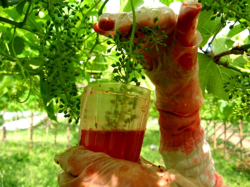 急に思い立ったように、午前10時から、デラの第2回目のジベ処理を行いました。桃の袋掛けの人たちの応援をお願いして、雨の予報、雷、すこしパラパラのなか強行しました。ジベ処理には雨は禁物です。最悪の場合再処理もありです。