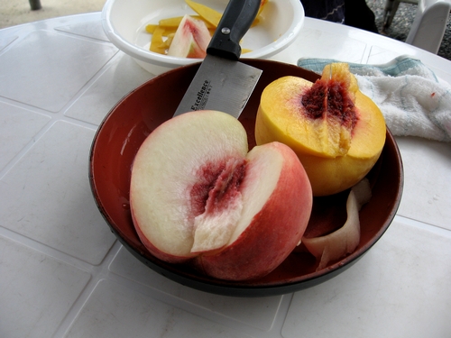 20日オープンにむけ気になる桃の熟度を見ました。まずまずの出来具合です。このペースで生育しますと、昨年のように「まだ早いから買い求めないで改めてお出かけください」なんていう言い訳は要らないようです。味はいまいち・・・香りは十分です。