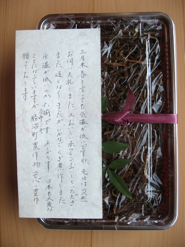 今年も関西に嫁いだ近所の同級生から手作りの「くぎ煮」が送られてきました。神戸の震災から立ち直られた経験の方からの今回の東北関東大震災への見舞いも添えられていました。