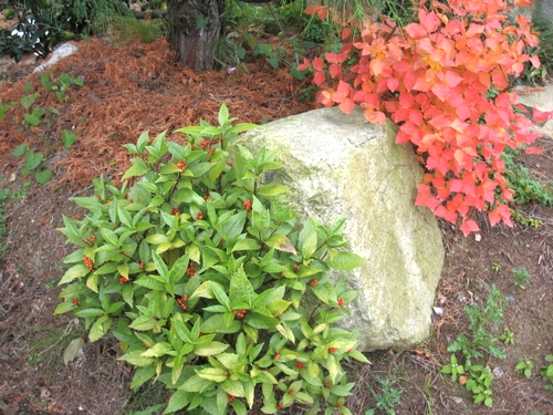 庭の「みつばつつじ」と「せんりょう」です。今年は本当の異常気象で、つつじも思い切り太陽の光を吸収して紅葉もさえています。反面せんりょうは夏の渇きで草丈はいまいちですが、多分これから厳しい寒さで実は素晴らしい真紅に変わると思います。