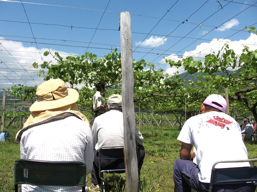 不安定な天気ですので、いつもの年より参加者が多いような気がしました。ぶどうは昨年より1週間以上遅れているとの説明でした。配布された資料を基にめいめいの畑で、自己責任で処理を行うことになります。