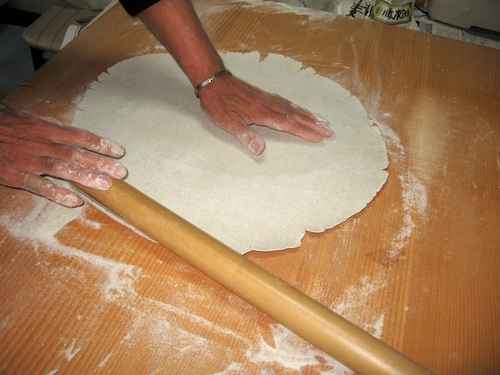 そば粉は、自前の畑で取れたそばを石臼で引き、粉はかなり荒めの粒つぶしたもの、つなぎの小麦粉は自前の農林61号、味が濃くて何の料理にもマッチするのだそうです。そば8、小麦粉2の割合でした。水を加えて練り上げていくうちに、そばの香りが素晴らしく感嘆の声しきりでした。一回目は加える水の量が少なすぎて包丁で切るときは折れ折れになってしまいましたが、これがあとで煮込みにしたのですが絶品でした。