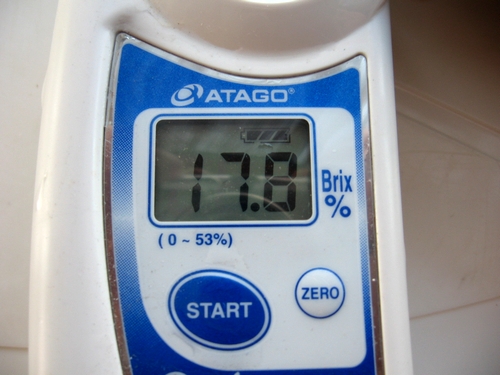 このところ、桃の糖度には自信が有りましたので計りませんでしたが、お客さんの声に誘われて計って見ました。19度を期待しましたが、17,8度でした。