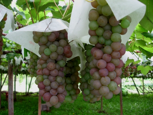 大きいぶどうですので、特製の(45センチ×60センチ)袋を作りました。大きいカレイを「座布団カレイ」などと呼びますが、座布団のような袋です。ご来園のときは、一目見てください。