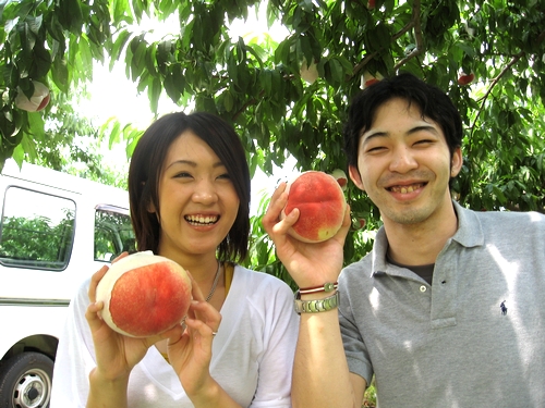 今日から浅間白桃のもぎ取りを開始しました。糖度も十分に乗り、今日の分については「日本一の桃ですよ」と説明しました。こんなお若い方が、いつまでもお幸せにと、願わずには居られません。