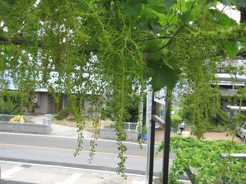 片や、駐車場のぶどうの手入れも順調です。